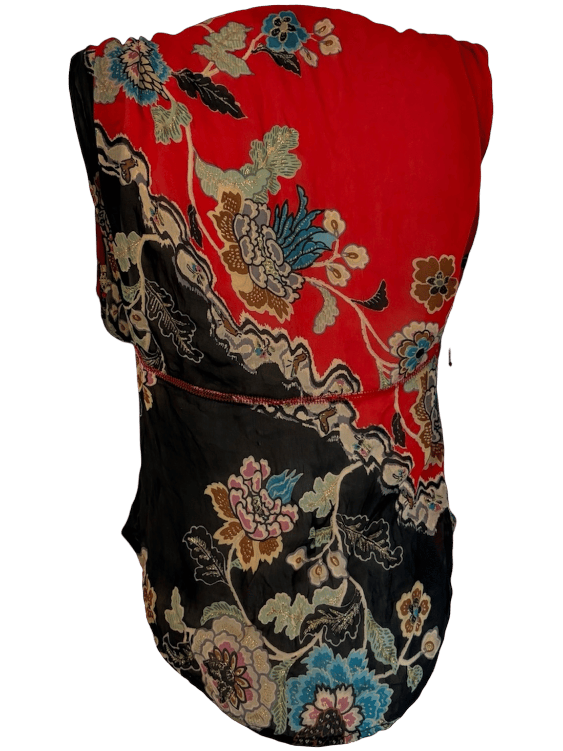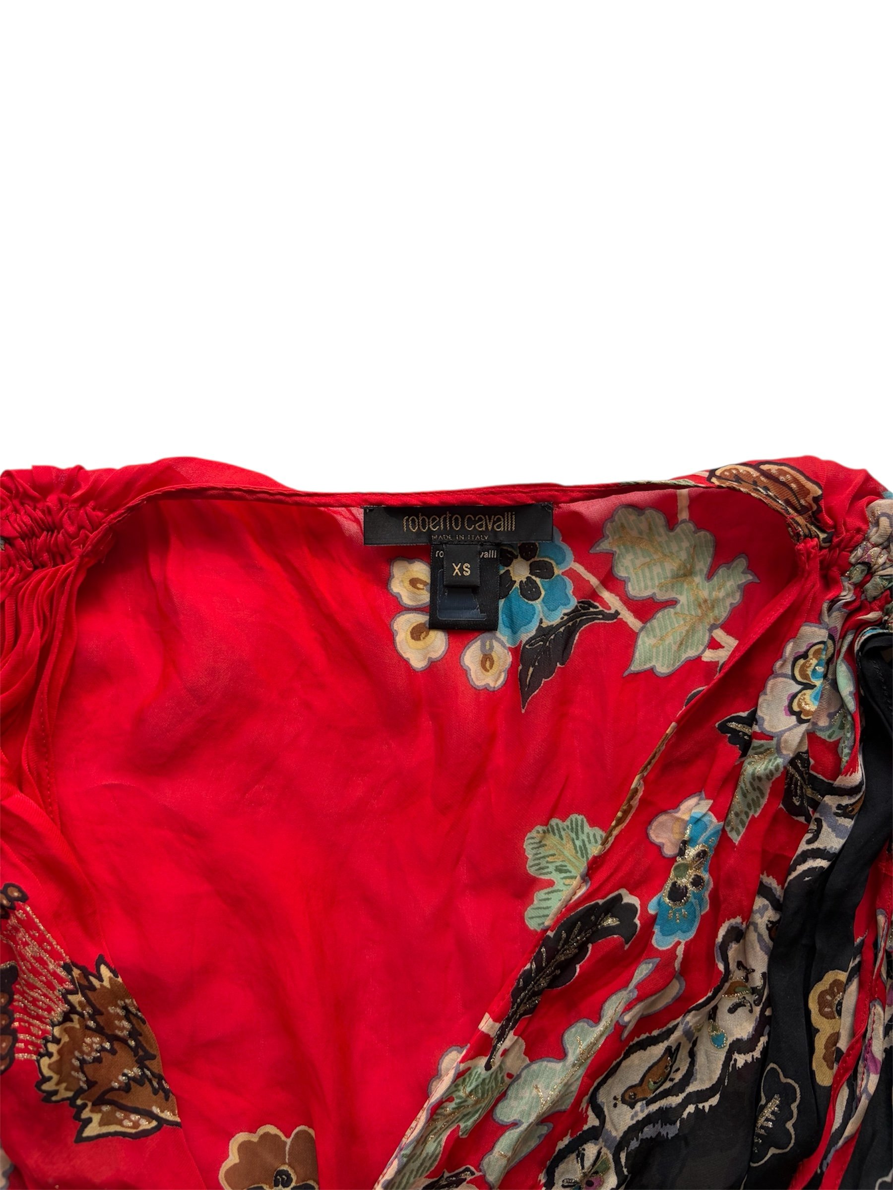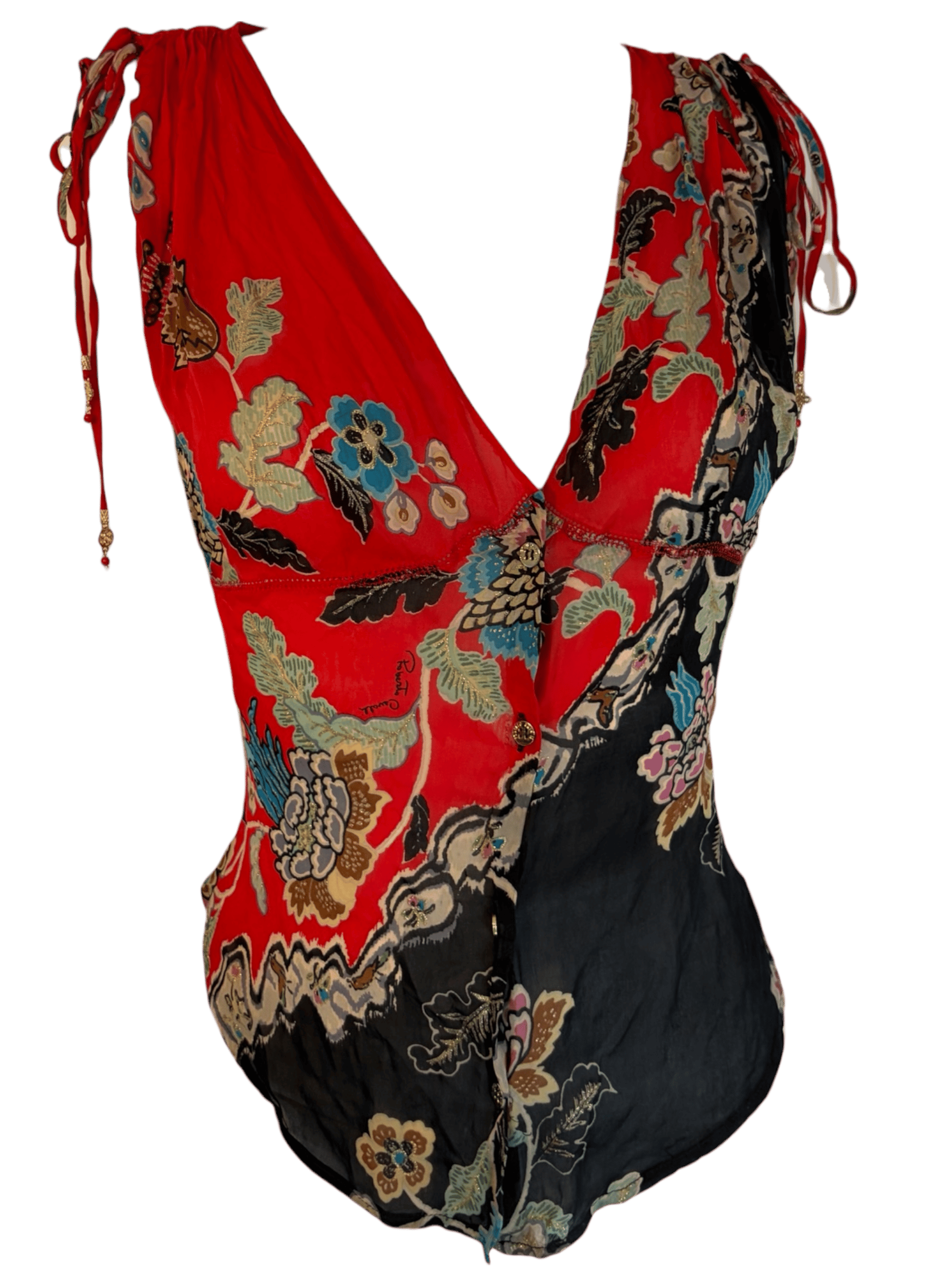 Roberto Cavalli S/S 2003 Chinoiserie Silk Top. Rare runway piece from Roberto Cavalli’s Spring/Summer 2003 collection. Crafted in vibrant red silk with an intricate chinoiserie-inspired floral print and exceptional detailing throughout. Lightweight with no stretch due to the silk fabrication. Marked size XS and fits true to size.
