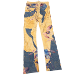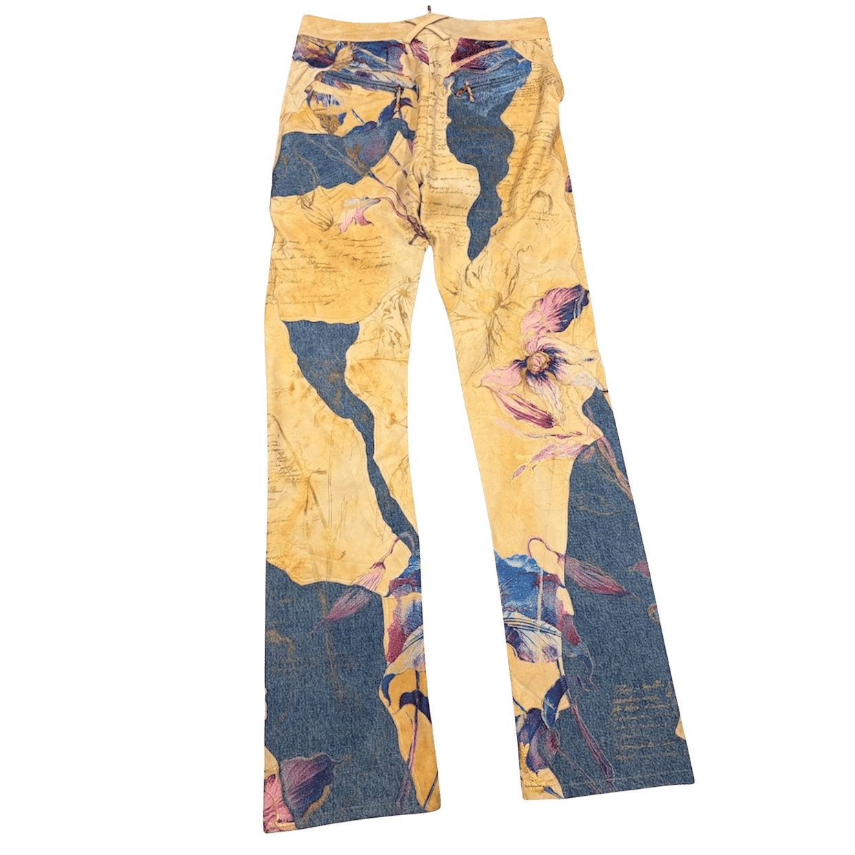 Vintage Roberto Cavalli Denim and Suede pants. Archival Roberto Cavalli pants from the early 2000s featuring a striking mix of soft suede and denim. Designed with a floral print overlay on the suede panels and shiny gold Cavalli lettering throughout. Lace-up front with matching suede laces, finished with bronze-tone metal detailing at the laces and back pockets. The suede is exceptionally soft and in great condition. Marked size XS and fits true to size.